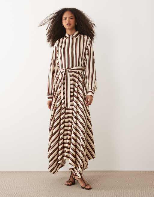 IYAL – Maxi-Hemdblusenkleid aus Satin in gestreiftem Braun mit Bindegürtel