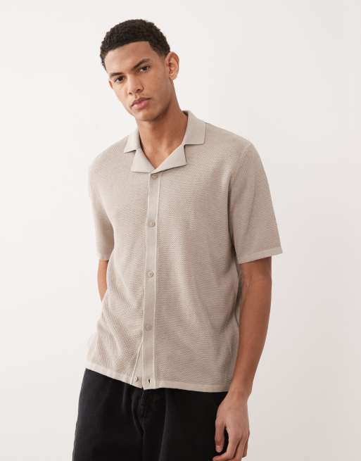 Jack & Jones – Durchgeknöpftes Strickhemd in Beige mit Reverskragen
