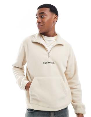 Jack & Jones – Fleece-Oberteil in Hellbeige mit „Originals“-Logo und kurzem Reißverschluss