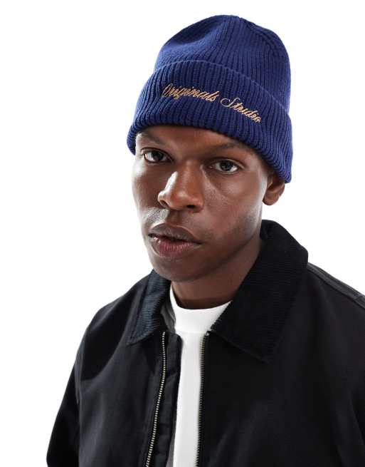 Jack & Jones – Original Studio – Mütze aus Rippstrick in Navy mit Stickerei
