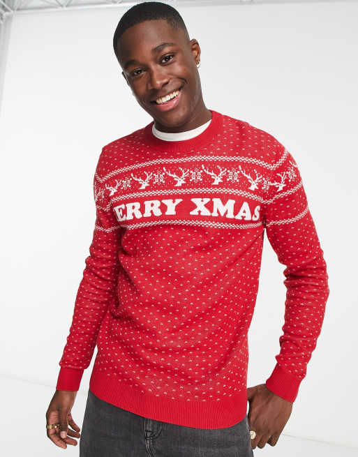 Jack & Jones – Originals – Weihnachtspullover mit Norwegermuster in Rot