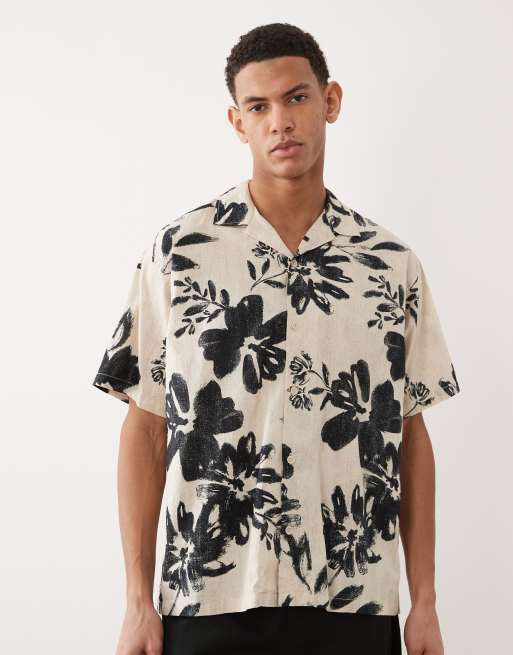 Jack & Jones Premium – Kurzärmliges Hemd in Beige mit Pflanzen-Print