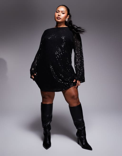 Jaded Rose Plus – Pailletten-Minikleid in Schwarz mit Wasserfall-Rückenausschnitt
