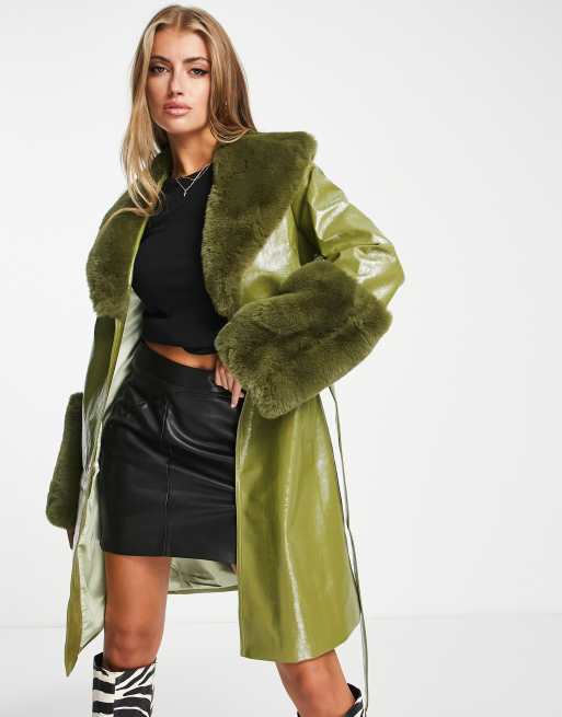 Jayley – Mittellanger Mantel in Grün mit Kunstpelzbesatz