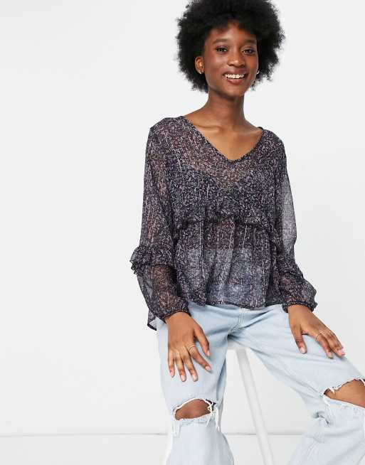JDY – Callie – Langärmliges, glitzerndes Weboberteil mit Rüschen in Schwarz