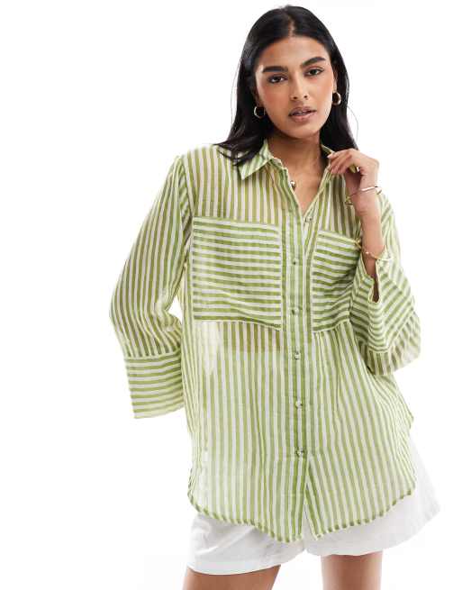 JDY – Kastige, texturierte, langärmlige Hemdbluse in Olivgrün und Beige gestreift