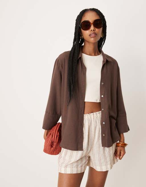JDY – Locker geschnittene Hemdbluse aus Leinen in Schokobraun