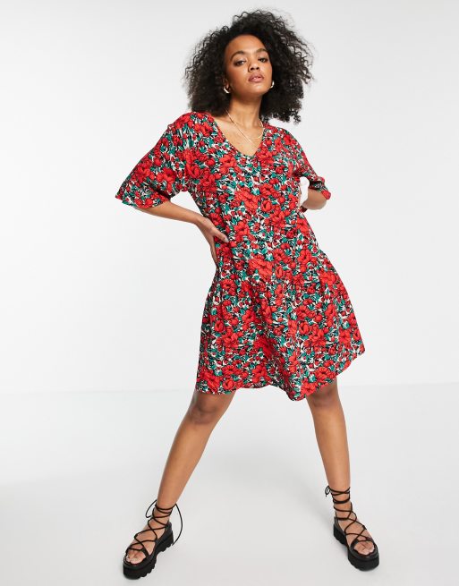 JDY – Mini-Hängerkleid in Rot geblümt mit Fledermausärmeln