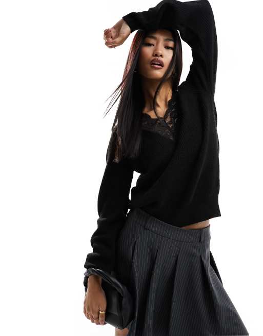 JDY – Wendepullover mit Spitzenbesatz in Schwarz