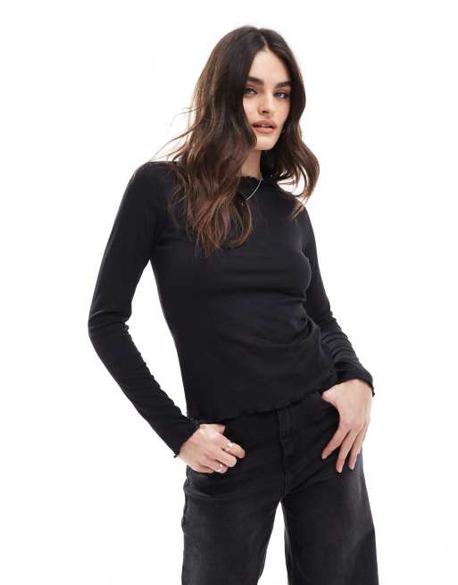 JJXX – Langärmliges T-Shirt in Schwarz mit Wellensaum