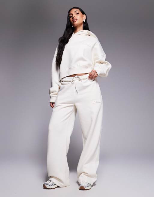 Kaiia – Cropped-Oversize-Kapuzenpullover mit hohem Baumwollanteil in milchigem Hellbeige mit Bubble-Logoprägung, Kombiteil