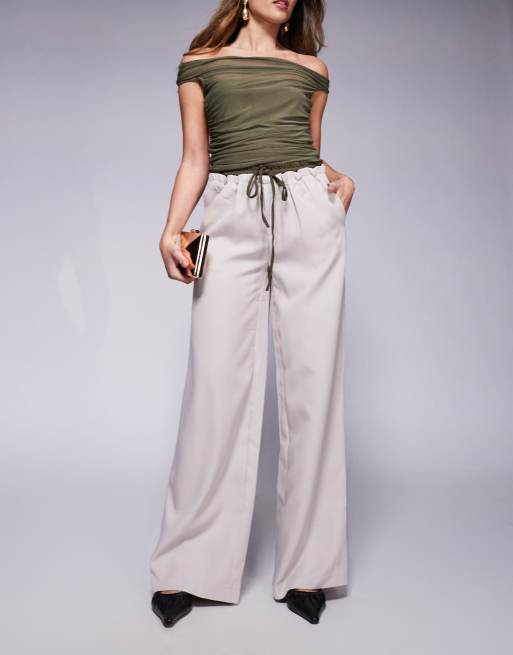 Kaiia – Exklusive Hose in Steinbeige mit weitem Bein und farblich abgesetztem Kordelzugbund