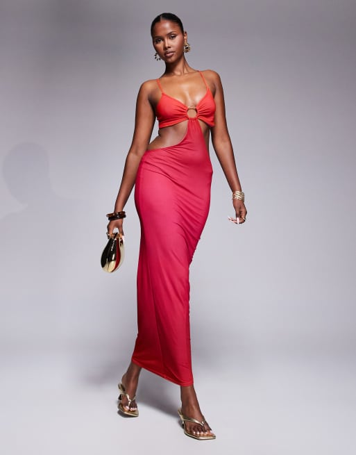Kaiia – Exklusives, doppellagiges Maxikleid in Rosa und Rot mit Ringdetail, Zierausschnitten und geschmeidiger Haptik