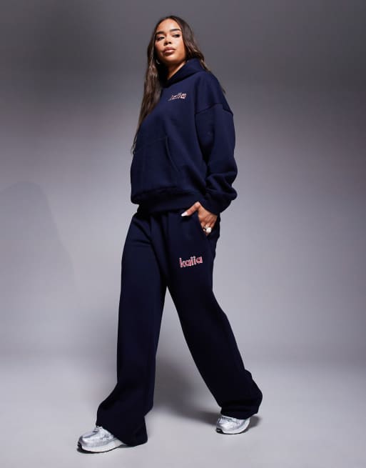 Kaiia – Jogginghose mit hohem Baumwollanteil in Marineblau mit weitem Bein und aufgesticktem Logo in Rot, Kombiteil