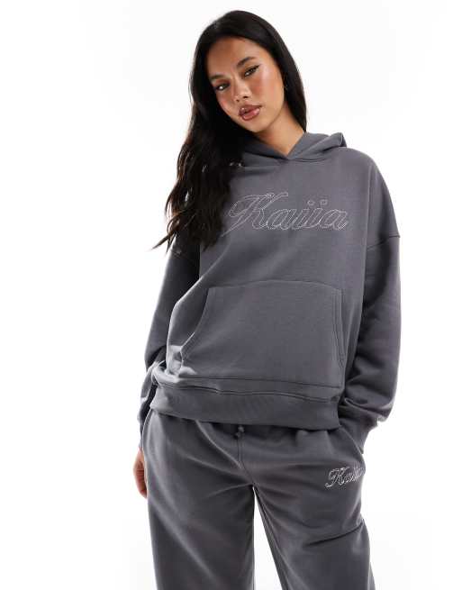 Kaiia – Oversize-Kapuzenpullover aus Baumwollmix in Anthrazit mit gesticktem Logo, Kombiteil