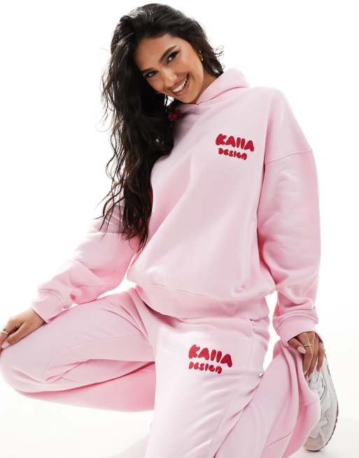 Kaiia – Oversize-Kapuzenpullover in Rosa und Rot mit plastischem „Design“-Logo, Kombiteil