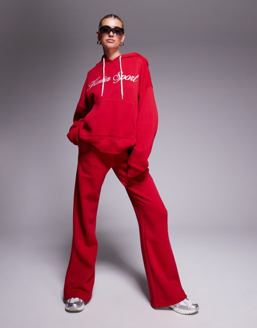 Kaiia Sport – Set in Rot und Weiß, aus Oversize-Fußball-T-Shirt mit V-Ausschnitt, Kapuzenpullover und Jogginghose