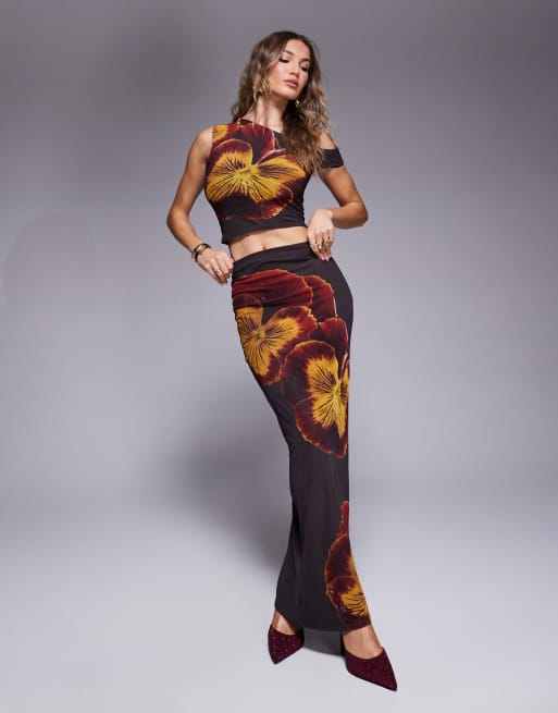 Kaiia x Sasha Corte – Exklusiver Netzstoff-Maxirock in Schokobraun mit Blumenmuster, Kombiteil