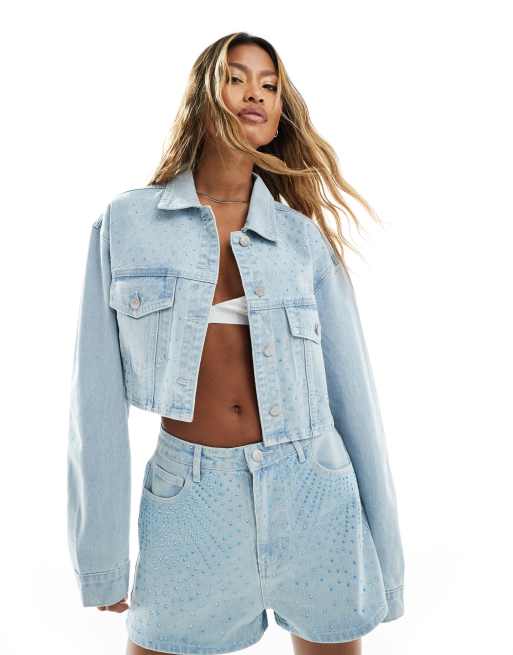 Kyo The Brand – Kurz geschnittene Jeansjacke in verwaschenem Hellblau mit Strassdetails, Kombiteil