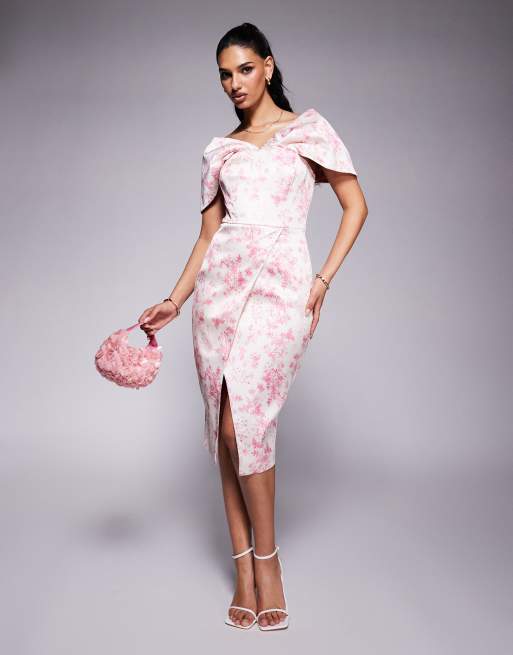 Lavish Alice – Drapiertes Bardot-Midikleid aus verstärktem Satin in Fuchsia mit Porzellanprint