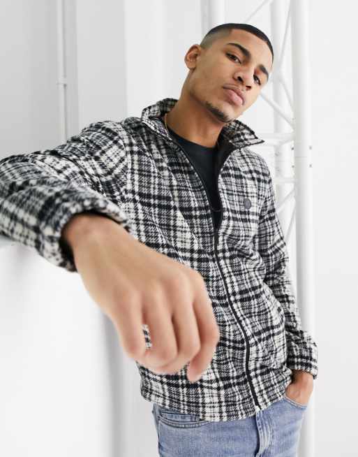 Le Breve – Karierte Fleece-Jacke in Schwarz und Weiß mit Funnelneck