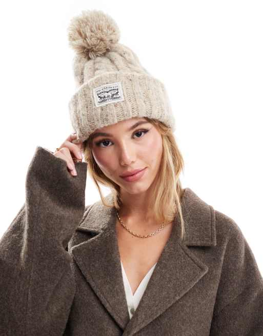 Levi's – Bommelmütze in gesprenkeltem Beige mit Zopfmuster und Logo-Aufnäher