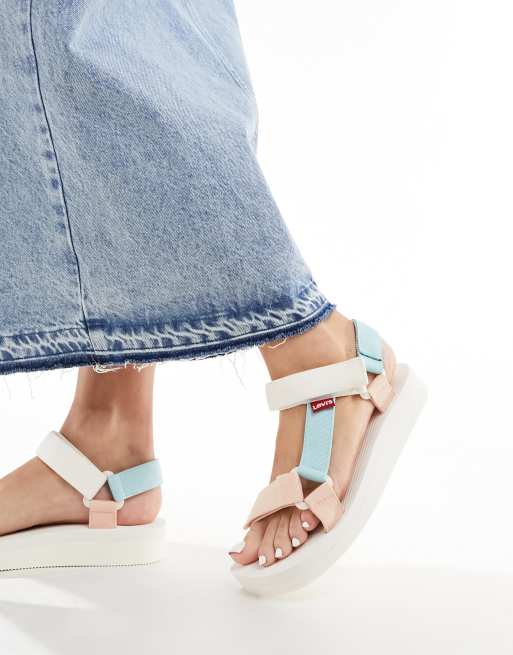Levi's – Cadys – Flache Riemchen-Sandalen in Weiß, Rosa und Blau mit Logo