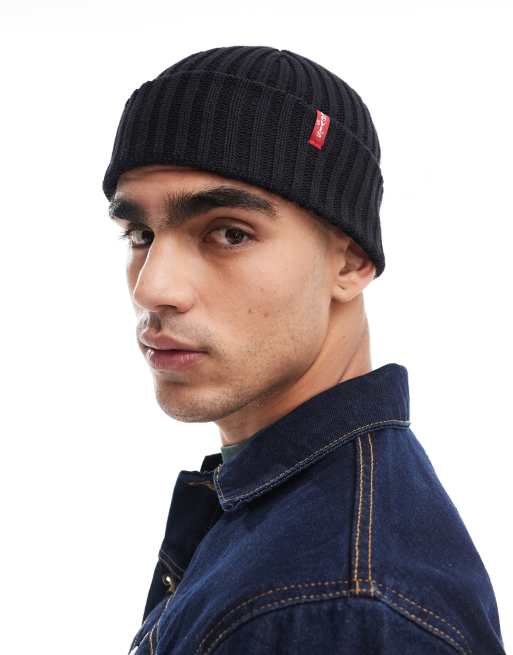Levi's – Gerippte Strickmütze in Schwarz mit rotem Tab-Logo