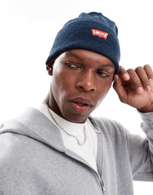 Levi's – Strickmütze in Marineblau mit roter Fledermaus-Stickerei