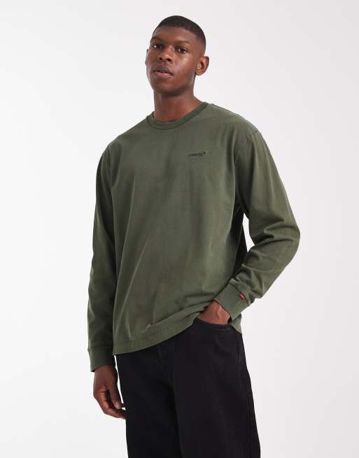 Levi's – Stückgefärbtes, langärmliges T-Shirt in Dunkelgrün mit Logo