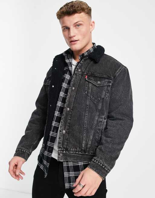 Levi's – Truckerjacke in verwaschenem Schwarz mit Sherpafleece