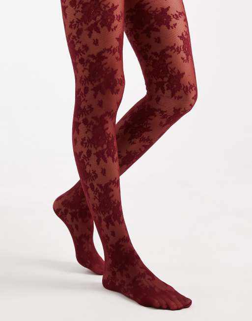 Lindex – Strumpfhose aus Blumenspitze in Burgunderrot, 40 DEN