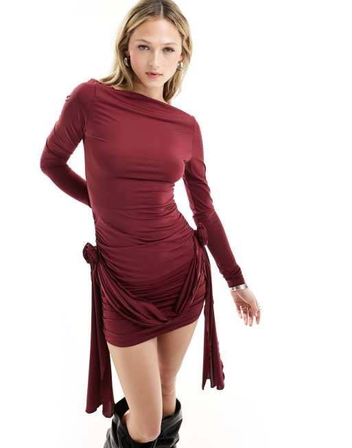 Lioness – Drapiertes Minikleid in Dunkelrot mit Stoffblume