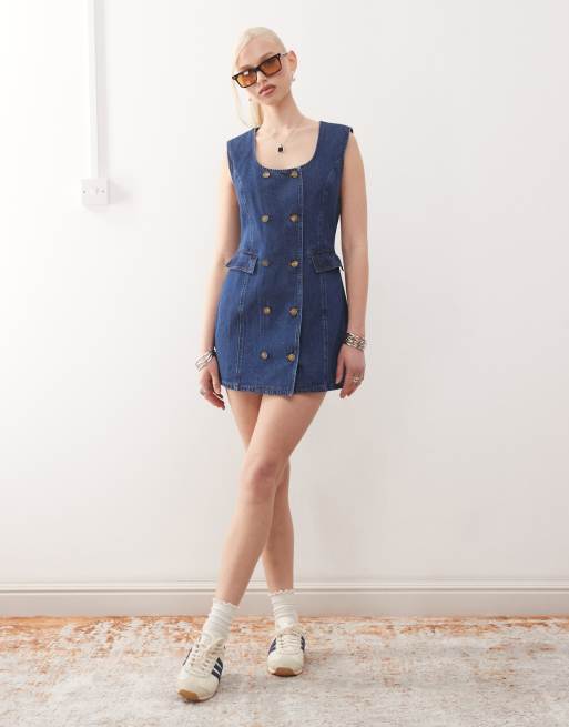 Lioness – Kurzes Jeanskleid in mittelblauer Waschung mit zweireihiger Knopfleiste und Taschen-Detail