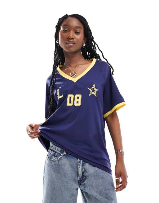 Lioness – Sportliches Jersey-Oberteil in Marineblau mit gelben Kontraststreifen und V-Ausschnitt