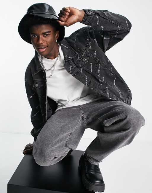 Liquor N Poker – Oversized-Jeansjacke in Schwarz mit durchgängigem Motorsport-Print, Kombiteil