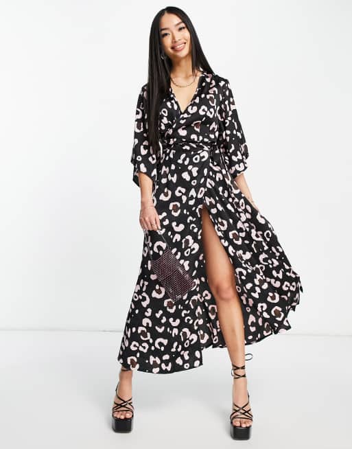 Liquorish – Midi-Wickelkleid in Schwarz mit Tierfellmuster