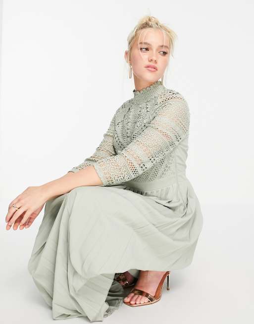 Little Mistress – Wadenlanges Kleid in Salbeigrün mit Spitzendetails