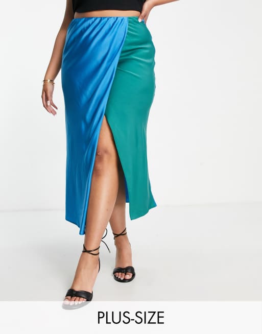 Lola May Plus – Midirock aus Satin in Blau mit Schlitz