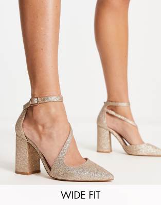 London Rebel Wide Fit – Spitze Schuhe in Gold mit Blockabsatz