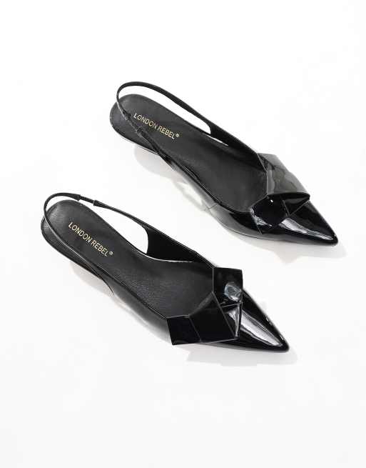 London Rebel – Fersenriemchen-Schuhe in schwarzer Lackoptik mit Schleifendetail und Pfennigabsatz, weite Passform