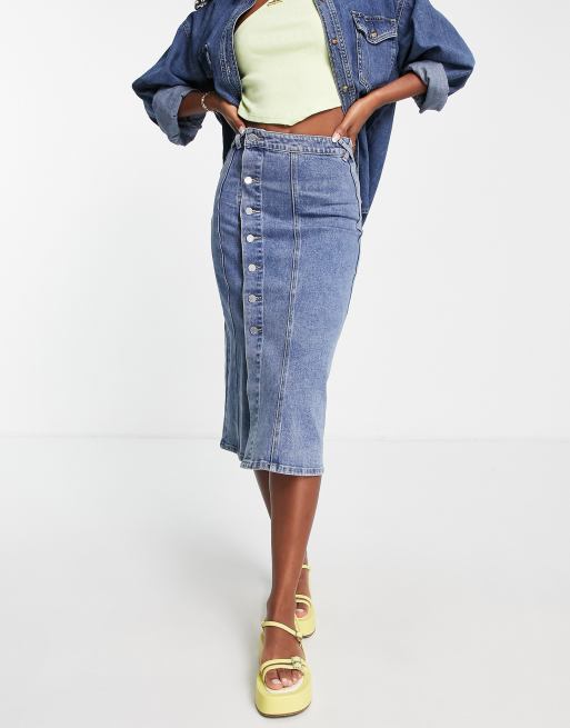 Lost Ink – Midirock aus Denim in Mittelblau mit Knopfleiste an der Seite