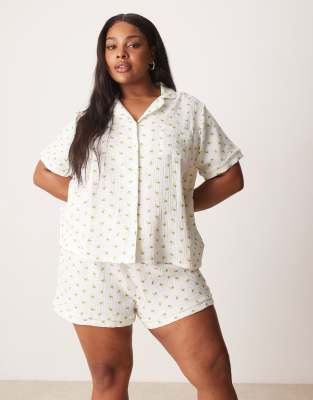 Loungeable Curve – Baumwoll-Pyjama mit kurzärmligem Hemd und Shorts in Elfenbeinweiß mit Knitterstruktur und Zitronenmuster