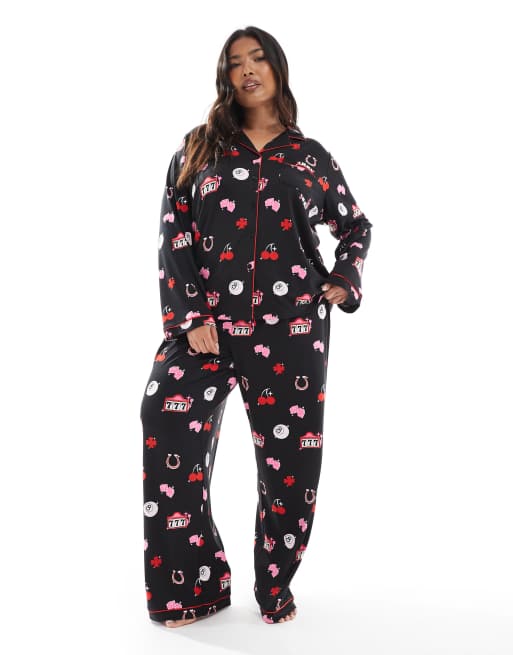 Loungeable Curve – Superweicher Pyjama aus Jersey in Schwarz mit Glückssymbol-Print