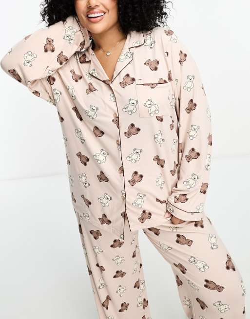 Loungeable Plus – Langer Pyjama in Braun mit Knopfleiste und Teddymuster