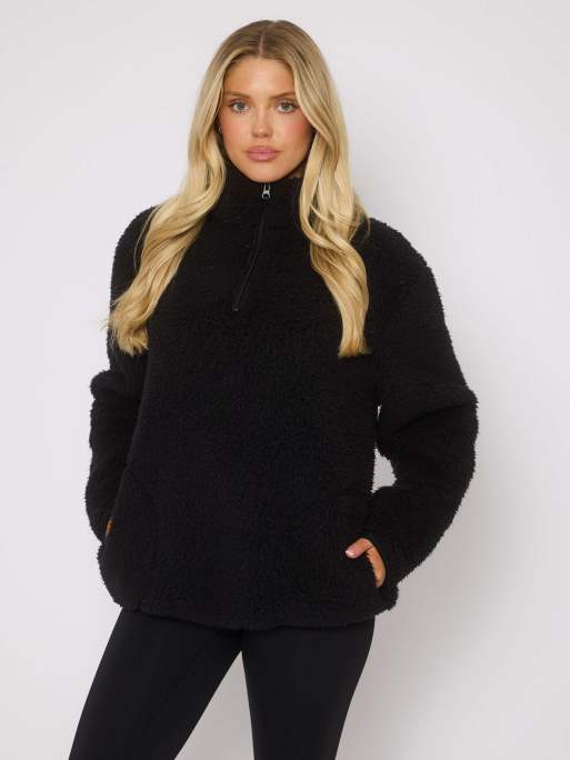 Loungeable – Pullover aus Teddyfell in Schwarz mit kurzem Reißverschluss und Taschen