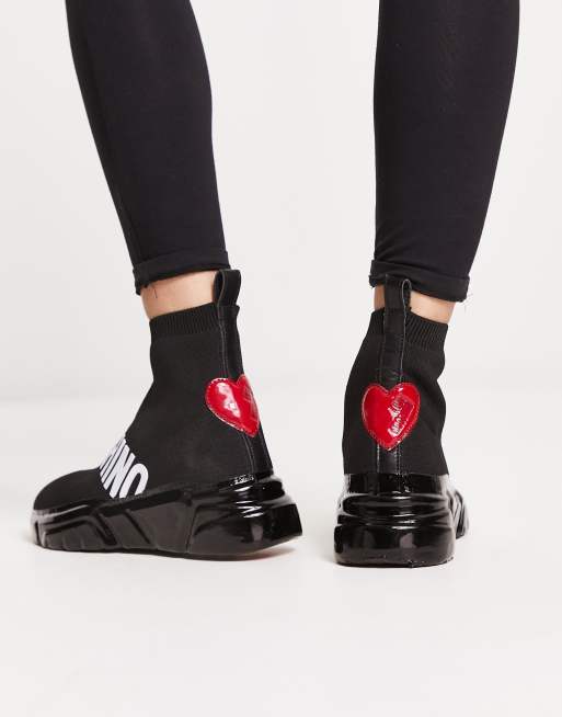 Love Moschino – Strick-Sneaker zum Hineinschlüpfen in Schwarz und Weiß mit Logo