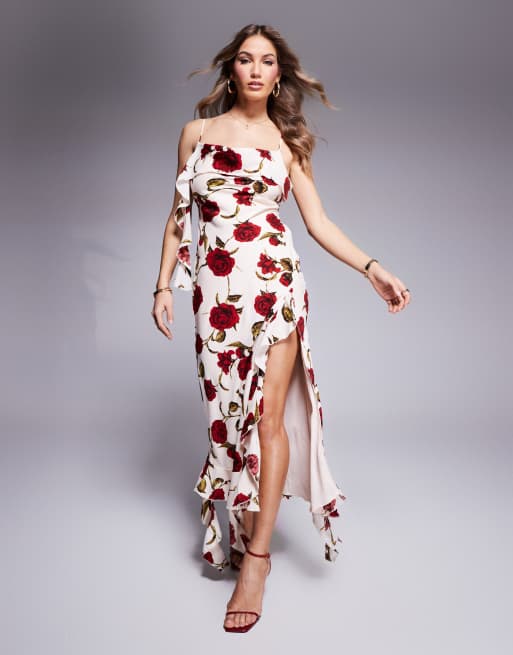 Love Triangle – Gerafftes Maxikleid mit Rosenprint und Rückenausschnitt