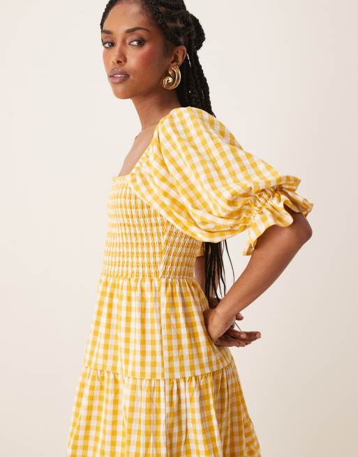 Lovedrobe – Kurzes Milchmädchenkleid in Gelb mit Vichy-Karos und Puffärmeln