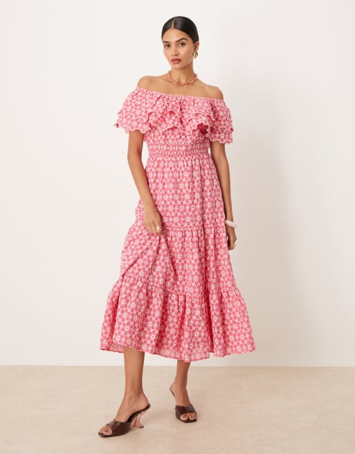 Lovedrobe – Midikleid in Rosa mit Stickerei und Carmen-Ausschnitt